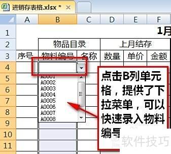11、 操作完毕后,点击B列空白单元格的下拉箭头,即可快速选择并输入物料编号。