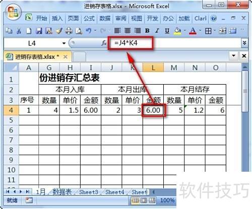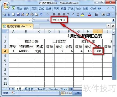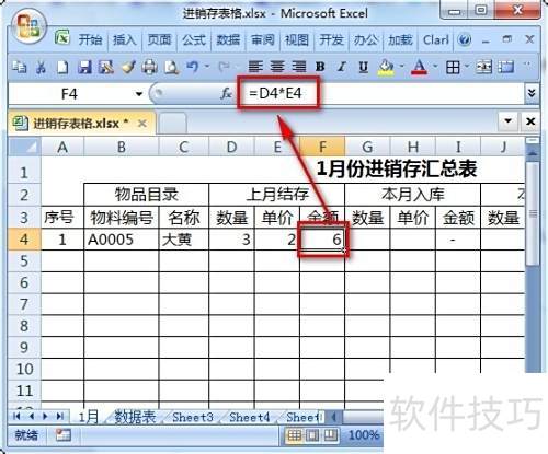 17、 在栏填写上月的数量与单价,金额栏输入公式=D4*E4,多个品种可横向依次填写。