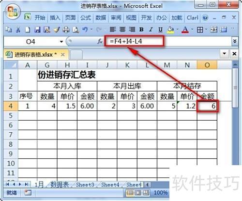 20、 在本月结存栏的数量单元格输入公式:=D4+G4-J4,金额单元格输入:=F4+I4-L4,单价单元格输入:=IFERROR(O4/M4,)。