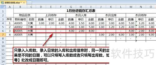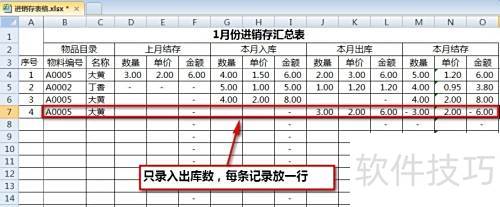 22、 日常录入时,同一天的出入库可合并记录于一行,也可分开录入。若需突出日期,可将列替换为日期,或新增一列专门填写日期信息。