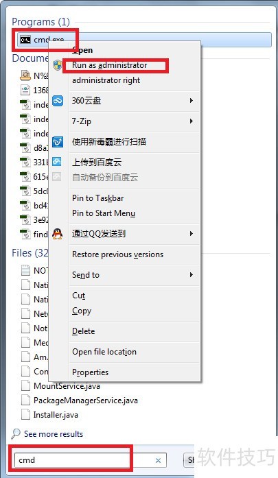 1、 在搜索框输入cmd,右键点击命令提示符图标,选择以管理员身份运行。