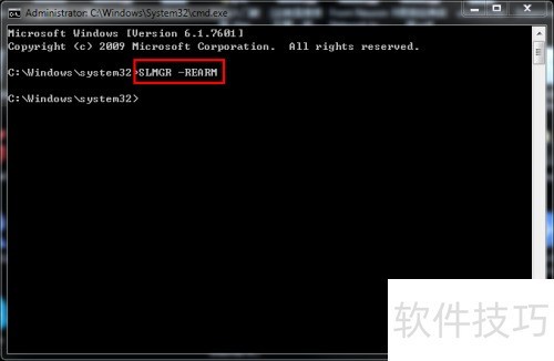 2、 在命令行中输入 SLMGR -REARM(注意-前有空格),按回车键执行该命令,操作效果所示。