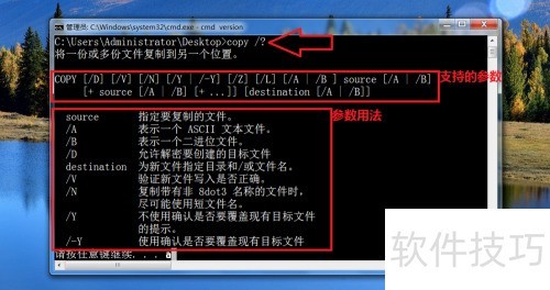 2、 在命令提示符中输入 copy /? 可查看该命令的语法和用法说明。