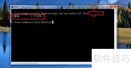 20、 复制二进制文件:使用 copy 命令将 rep.exe 复制为 msdos.exe,参数 /B 表示按二进制模式操作。
