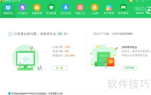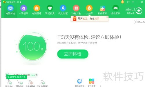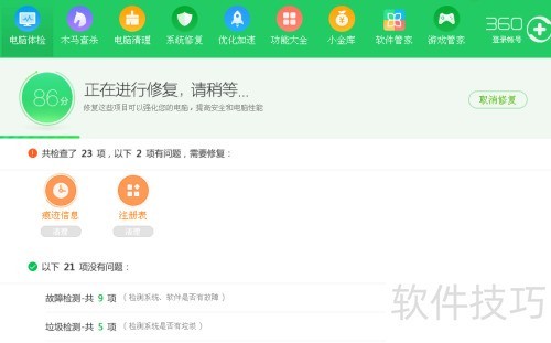 1、 启动360安全卫士,依次进行电脑体检、查杀木马、清理垃圾、修复系统及优化加速操作。
