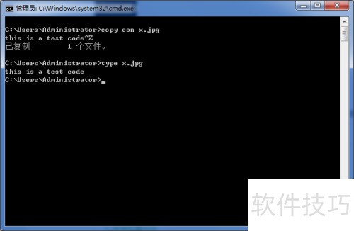 3、 在提示符后输入copy con x.jpg,接着输入一串数字编码(仅作示例,实际文件格式有特定文件头与块结构,此处不展开说明),最后按下Ctrl+Z结束输入,即可生成一个jpg格式的文件。