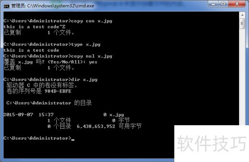 6、 使用copy命令可清空先前创建的文件,具体操作如下所示。