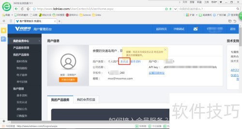 4、 首先需完成账号实名认证,认证通过后,系统将在用户管理后台首页自动生成API KEY与用户ID,此两项信息即为对接kdniao接口的唯一身份凭证。