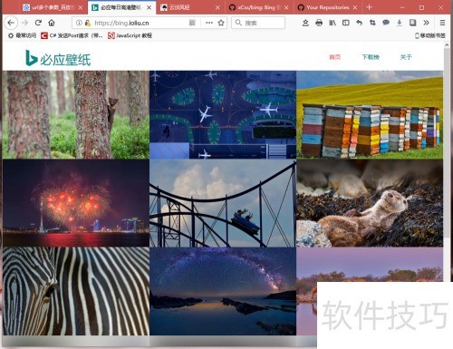 1、 首先登录Bing壁纸网站(通过搜索并打开),所示。该网站由第三方运营,专门收集并提供Bing每日搜索页面的背景图片。