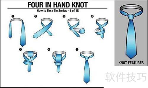 1、 四手结是领带中最基础的打法,简单易学,适合新手,但因结形较小,与宽领衬衫搭配效果不佳。