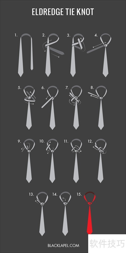 2、 Eldredge结与Trinity结类似,均使用领带较窄的一端进行打结。前五步采用半温莎结的打法,先形成第一层结体,随后在此基础上再缠绕第二层。完成打结后,需将末端多余的部分插入结的后方隐藏。整体造型层次分明,适合搭配领口较宽的衬衫,与温莎结一样,能展现出稳重而优雅的视觉效果,适用于正式或半正式场合。