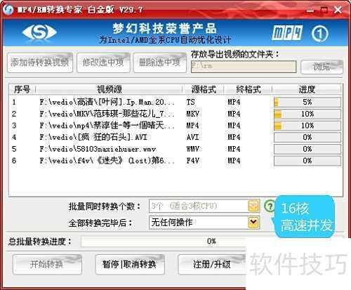 8、 设置完成后返回主界面,根据CPU核心数量在批量同时转换个数中选择合适的并发数。点击开始转换,即可快速将iPhone电影转换为MP4格式。软件最高支持16核心并行处理,能充分发挥多核性能,显著提升转换速度。随着硬件不断升级,并发转换在效率上的优势愈发突出,大幅缩短等待时间,带来更流畅高效的使用体验。