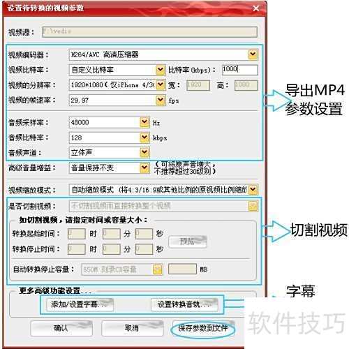 6、 所示,MP4/RM转换专家不仅支持导出MP4格式,更全面考虑移动设备使用需求,提供音量增强、视频剪辑、字幕添加、音轨选择等多项实用功能,充分满足各类视频转换需求。当需批量处理大量视频且参数相同时,可点击右下角保存参数按钮,后续通过加载已保存的参数,快速完成批量转换,大幅提升处理效率。