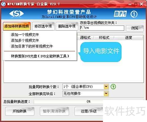 1、 在软件主界面左上角点击添加待转换视频按钮,从下拉菜单中选择合适的导入方式完成文件导入。MP4/RM转换专家提供多种人性化导入选项,操作便捷。其右下角的DVD全能转换工具可将DVD光盘内容转换为iPhone兼容的MP4格式,适配各类电影资源,转换效果清晰稳定,满足多样化的视频处理需求。