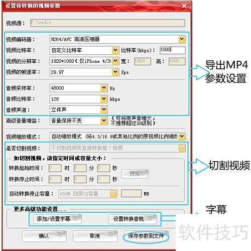 6、 所示,MP4/RM转换专家不仅支持导出MP4格式,更充分考虑移动设备使用需求,提供音量增强、视频剪辑、字幕添加、音轨选择等多项实用功能,全面满足视频转换中的各种操作需求。当需批量转换且参数相同时,可点击右下角保存参数,后续通过加载已存配置,轻松实现高效批量处理,大幅提升转换效率。