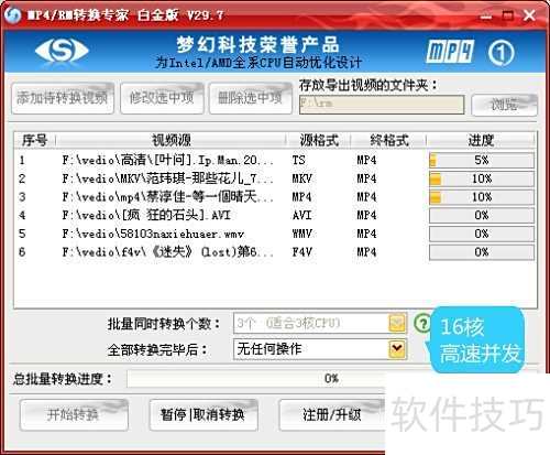 8、 设置完成后返回主界面,在批量同时转换个数中根据CPU核心数量选择合适的并发数。点击开始转换,即可快速将iPhone视频导出为MP4格式。该功能最高支持16核同时处理,能充分利用多核性能。随着硬件不断升级,多线程转换带来的速度优势愈发显著,大幅缩短转换时间,提升工作效率,尤其适合处理大量视频文件。