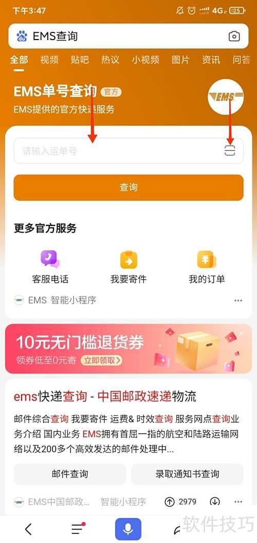 打开手机百度APP,搜索EMS查询,进入EMS智能小程序,通过输入或扫描运单号,点击查询按钮,即可获取快递的详细物流信息。