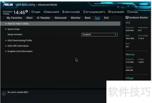 3、 重启电脑后,在开机过程中连续按下键盘上的DEL键,进入华硕主板的BIOS设置界面,切换至Tool选项,选择ASUS EZ Flash进行操作。