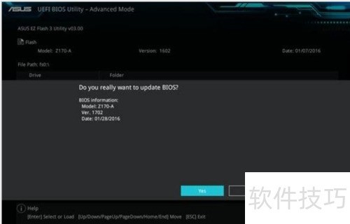 6、 选择Storage模式后,系统会显示U盘中的文件。找到并选中预先存入的BIOS升级文件,屏幕将提示是否进行验证并刷新BIOS,此时需点击是确认。确认后,EZ Flash将自动启动,开始执行BIOS更新过程,期间请勿断电或操作设备,等待更新完成即可。