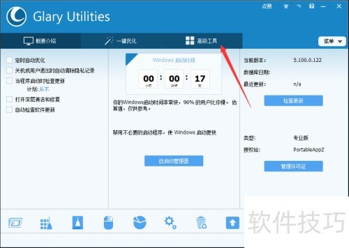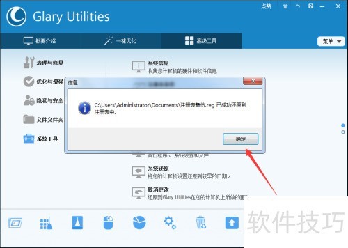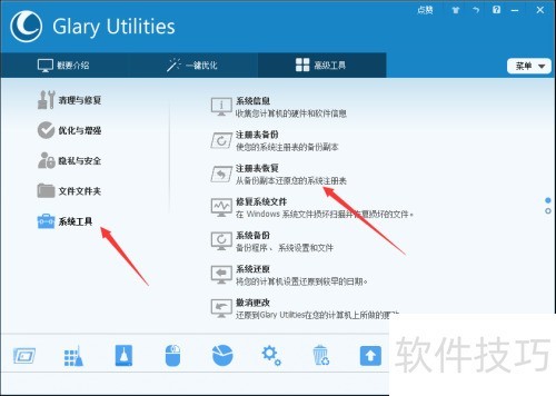 1、 恢复注册表操作简便,可借助Glary Utilities软件,在主界面选择高级工具功能进行处理。