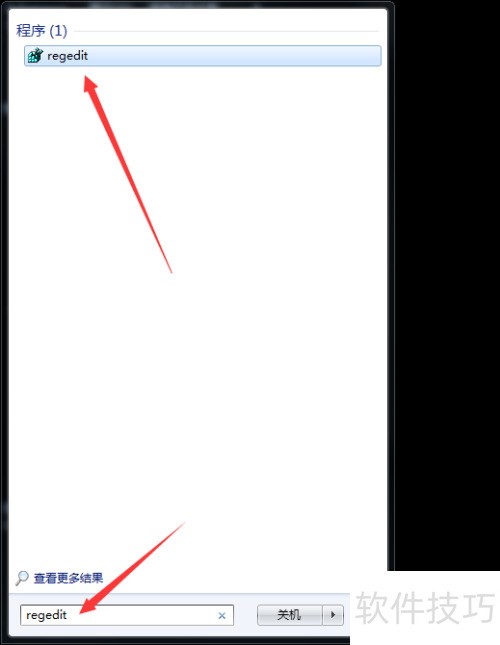 5、 在开始菜单中输入regedit,点击搜索结果即可打开注册表编辑器。