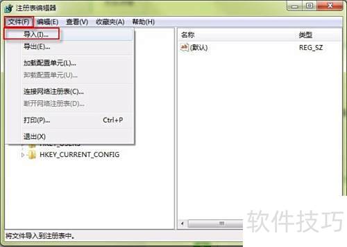 4、 启动注册表编辑器,点击文件菜单中的导入,随后弹出导入注册表文件窗口,选择相应文件完成导入操作。