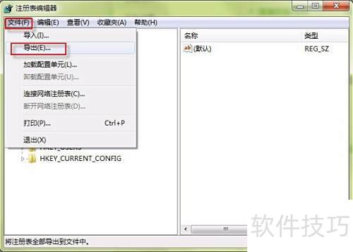2、 在注册表编辑器中点击文件菜单,选择导出,随后弹出导出注册表文件对话框。