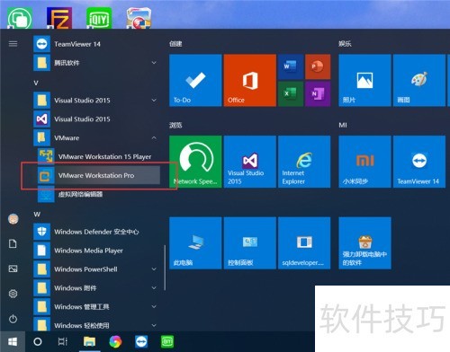 1、 打开开始菜单,选择VMware中的VMware Workstation Pro,即可启动版本为15.0的软件程序,进入虚拟机操作界面,准备进行后续的虚拟环境配置与管理任务。