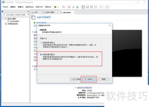 4、 可选择链接克隆或完整克隆两种方式。链接克隆会创建与原始虚拟机关联的新虚拟机,原机不可删除;完整克隆则生成一个完全独立、与原机一致的副本,不依赖原虚拟机。通常推荐使用完整克隆,设置完成后点击下一步继续操作。