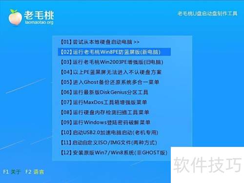 1、 将老毛桃装机版U盘插入电脑USB接口,重启并在开机画面出现时按下快捷键进入启动菜单。在选项列表中选择运行老毛桃Win8PE防蓝屏版(新电脑),按下回车键确认,所示操作即可。