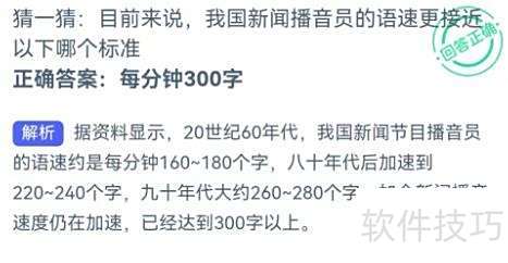 1、 在支付宝蚂蚁新村中,有一道题问:我国新闻播音员的语速最接近哪个标准,需结合实际语速判断选项。