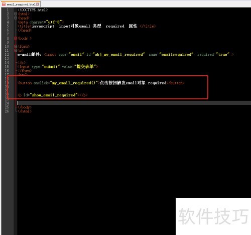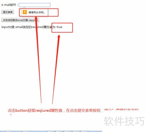 8、 在浏览器中打开文件,点击按钮查看获取的required属性值,提交表单时若email字段为空,系统将提示用户填写该字段。