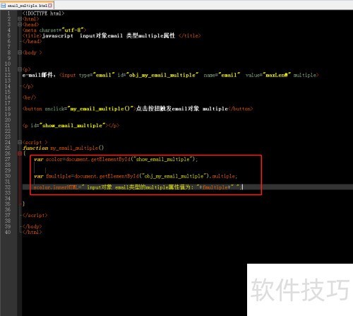 2、 创建一个input元素,将其类型设为email,指定id为obj_my_email_multiple,并启用email输入框的multiple属性,允许用户输入多个邮箱地址。