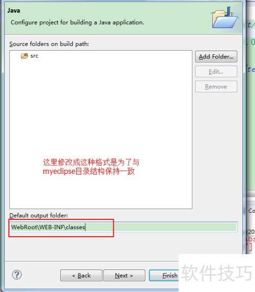 4、 输入Web工程目录结构:WebRoot/WEB-INF/classes,然后点击下一步按钮继续操作。