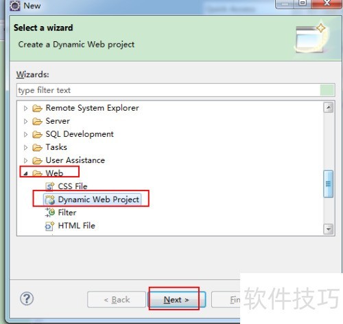 2、 向下滚动,找到 web 选项,选择动态 Web 项目,然后点击下一步。