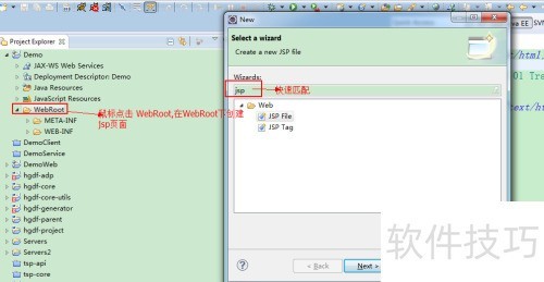 6、 打开新建的web项目,进入WebRoot目录,按Ctrl+N创建JSP页面。