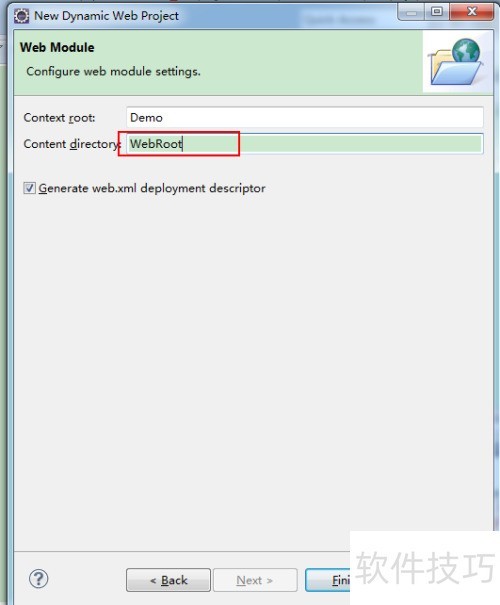 5、 将内容目录修改为WebRoot,然后点击完成按钮,即可成功创建。