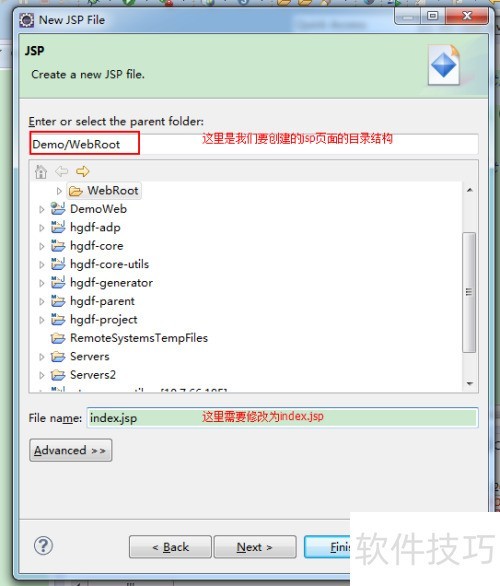 7、 创建页面时,需先确认JSP目录结构是否正确,注意上方红圈标注部分。
