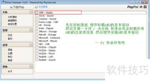 5、 Driver Sweeper 是一款专门用于清除显卡及其他驱动程序残留注册表信息的工具。在卸载相关程序后,可运行该软件,勾选AMD DISPLAY选项,随后点击分析按钮,待扫描完成后执行清理操作,彻底清除残留数据,有助于系统优化和新驱动的正常安装。软件下载地址:www.400gb.com/file/29196960。