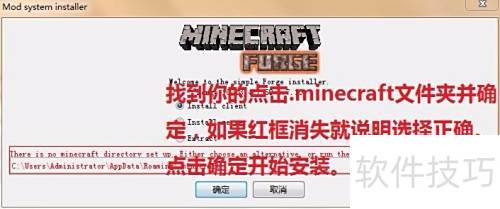3、 下载并打开Forge后,点击右下角的三个点,定位到Minecraft的安装目录(即.minecraft文件夹),确认选择。当红色边框消失时,表明路径已正确设置。再次点击确认,等待约一分钟完成安装。若过程中无任何错误提示,即代表Forge已成功安装,可正常启动游戏。
