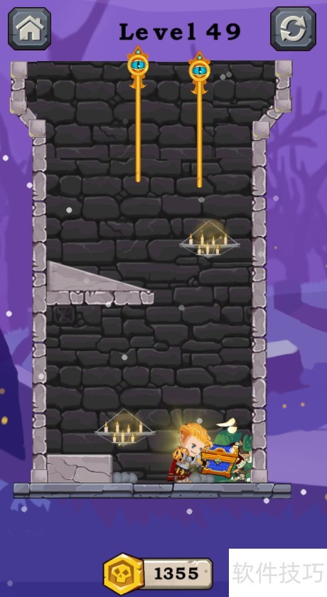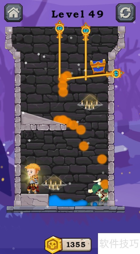 1、 本关有五个插销,需利用岩浆清除下方骷髅士兵,具体情形见图示。