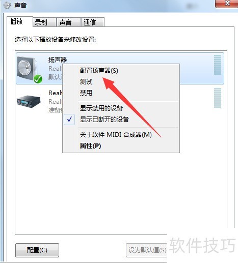 4、 右键当前输出设备,进入声音设置,选择配置扬声器选项。