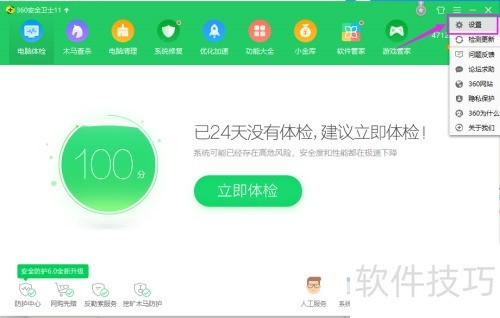 1、 启动安全卫士,进入主菜单右上角,点击设置选项。