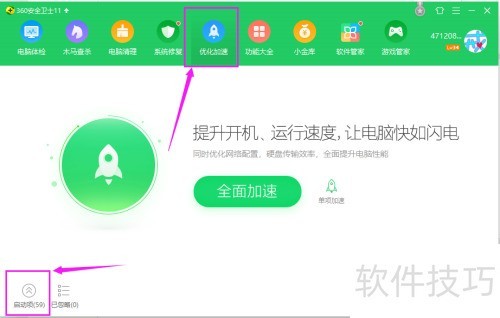 3、 进入主页面菜单,选择优化加速,点击左下角的启动项功能。