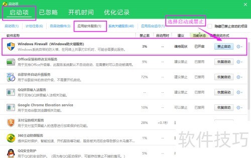 4、 进入启动项主菜单,选择应用软件服务子项,找到Windows Firewall程序,根据需要设置为恢复启动或禁止启动即可。