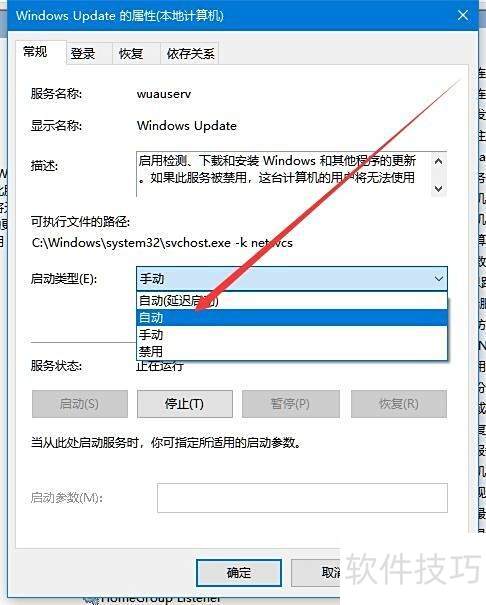 5、 为确保服务日后能自动运行,点击启动类型下拉按钮,从菜单中选择自动选项即可。