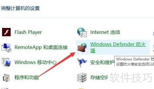 7、 进入Windows 10控制面板,找到并点击Windows Defender防火墙选项。