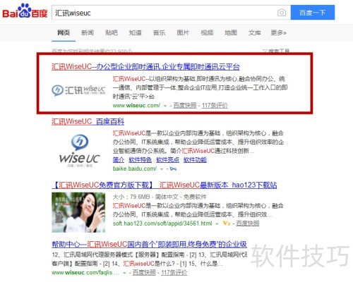 1、 访问百度,搜索栏输入汇讯wiseuc,点击搜索结果中的官网链接即可进入。