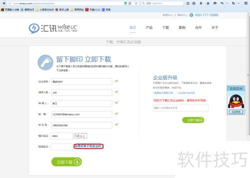 3、 请如实填写注册信息,以便客服为您提供精准的即时通讯解决方案,并注意免费获取手机验证码。