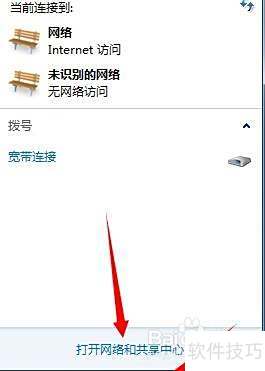 1、 点击任务栏网络图标,进入面板后选择打开网络和共享中心即可。